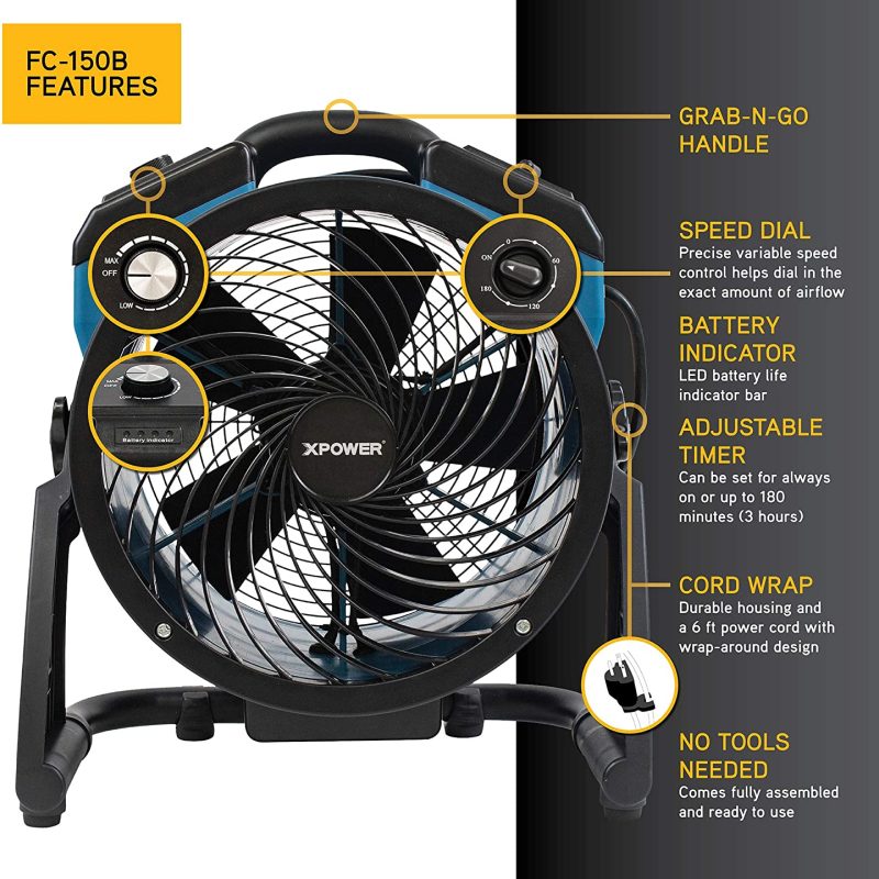 XPOWER’s FC-150B Brushless DC Motor Rechargeable Whole Room Air Circulator brings you all the features packed in your advanced XPOWER air circulator, but now with the freedom of cutting the cord. That’s right, utilize 1000 CFM of whole room air circulating power cord free. With its built in re-chargeable battery, charge up the unit and take your axial air mover anywhere you need air circulation, ventilation, or drying needs. XPOWER’s air movement technology leads the industry in features. Our in-house designed and manufactured brushless DC motors develops large amounts of torque to propel the air speed and volume you need for whole room circulation. The energy efficiency of our industry leading brushless DC motor can shine in this dual purpose AC/DC application helping to keep your utility costs down and extending the battery life during use. Extended and focused airflow is what you’ll get from our deep pitch designed fan blades and spiral grille design. You also get the convenience of a 3-hour Set-N-Forget timer or the option of Always-On setting. Precise variable speed control helps dial in the exact amount of airflow needed. The beauty of XPOWER variable speed and brushless DC motor technology gives you one of the quietest whole room air circulators in the market. The LED battery power indicator will help you know when it’s time to plug in or recharge. Our air circulators are one of the most versatile in the industry with an included stand for 360-degree coverage. Experience the next generation of air movement with XPOWER’s FC-150B Brushless DC Motor Rechargeable Whole Room Air Circulator.