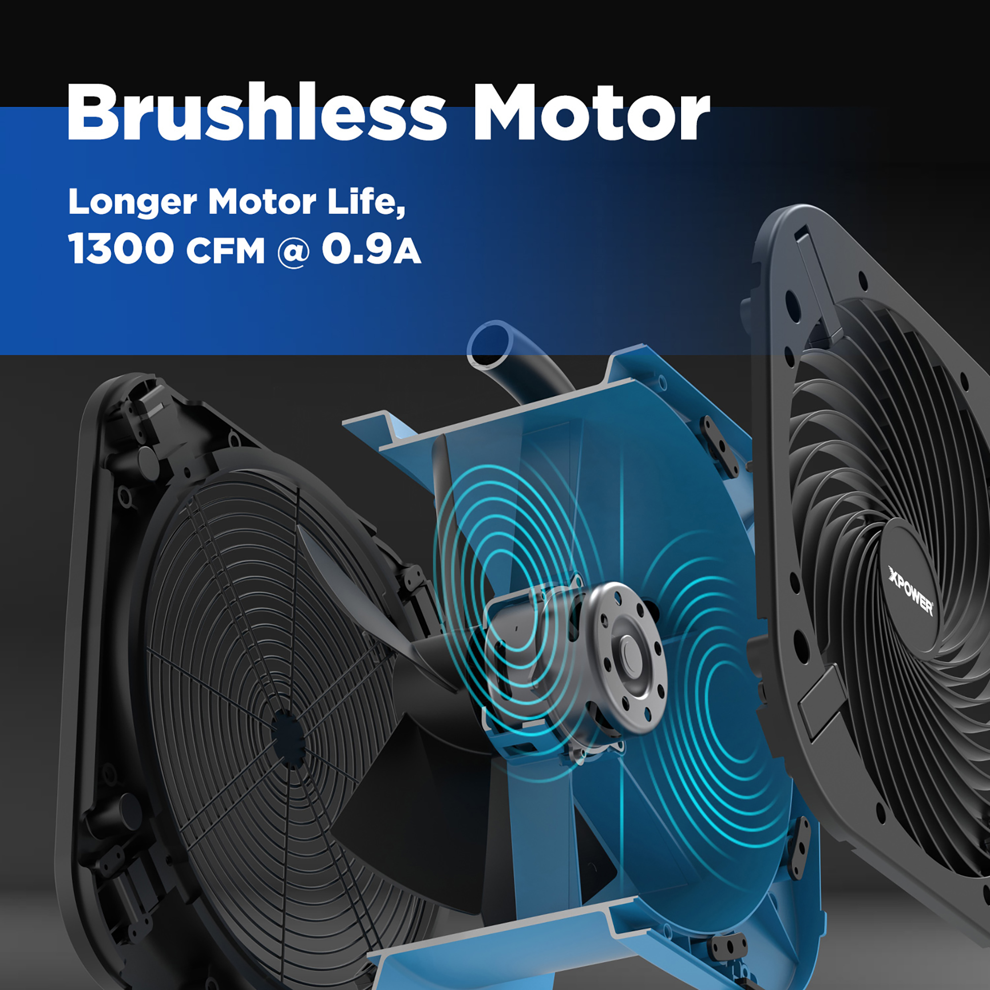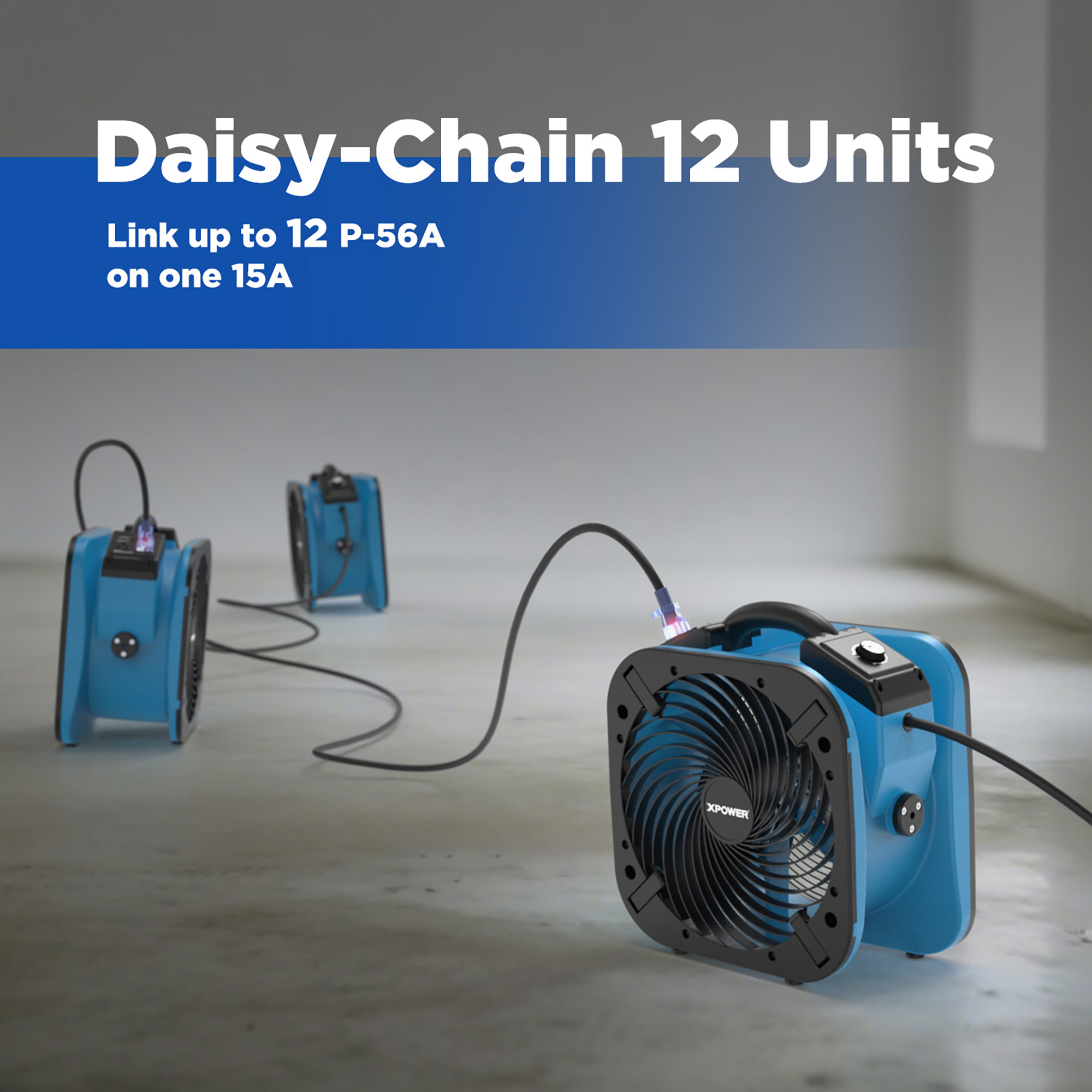 The new P-56A is our newest compact Axial air mover, perfect for floor/carpet drying and uniquely set up for upholstery drying. Features multiple setup positions, stand up, downdraft, updraft, and angled. Built-in legs pop out of both front and rear grill, to set up for ceiling or downdraft positions. Both front and rear grill features a ½” indent to plug in a ½” pvc rod for even more drying positions. Using only 0.9 Amp of electricity while producing 1,300 CFM of focus air flow, the P-56A packs a big punch in a compact, easy to transport design. Utilize the built-in power outlets to daisy chain up to twelve P-56A axial air movers on one power outlet. The P-56A comes with a 15 feet long power plug with an LED lighted plug end (making it easy to determine if the outlet have power). The compact yet rugged injection molded polypropylene housing is lightweight and stackable up to 6 units high for easy transporting. No matter what the application is – carpet or floor drying, ceiling or attic/crawlspace, upholstery drying, water damage restoration, ventilation, home DIY projects, garage or workshop projects, or for climate control, P-56A is the perfect choice for you.