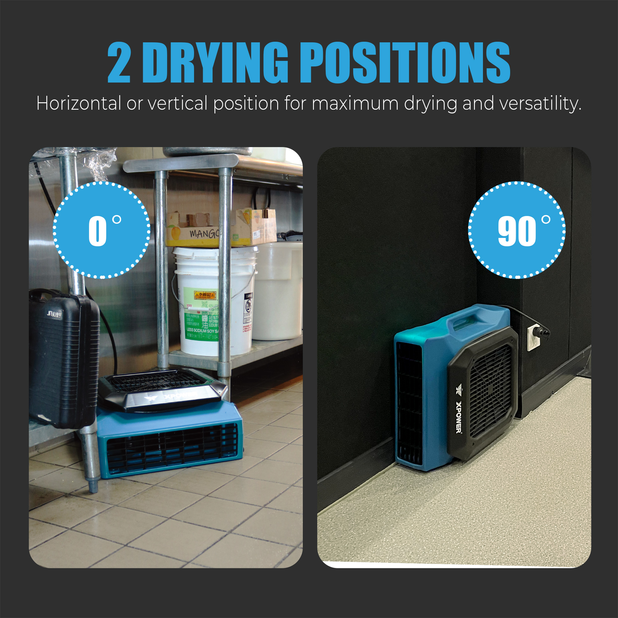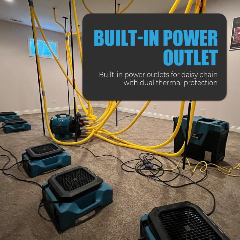 The XPOWER PL-700A Low Profile Air Mover features powerful ventilation in a compact size that does not compromise on power. A 1/3 HP motor and large intake area generate a high volume of extended airflow which has the velocity to maximize drying area efficiently. Strategically placed vents on the underside of unit dry surface below the fan. The PL-700A’s durable polypropylene plastic housing, three speed switch and built in daisy chainable power outlets makes this unit versatile for a variety of drying applications. Stackable up to 6 units high, this unit’s slim profile is the most compact in its class, with a deep nested stackable design for stable transportation. Unit can be positioned horizontally or vertically for drying and storage. A lightweight design and ergonomically positioned molded handle makes the XPOWER Low Profile series of air movers the new industry favorite.