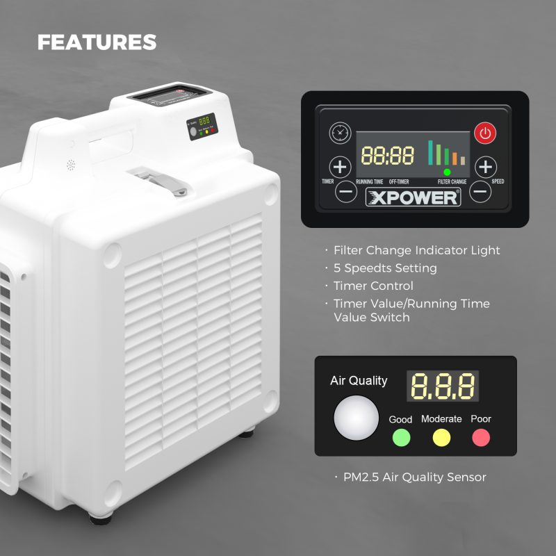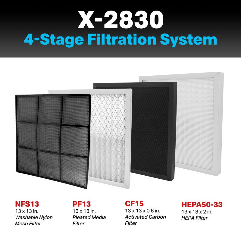 Designed with the unique needs of businesses, clinics, hospitals, hotels, and similar facilities in mind, the XPOWER X-2830 commercial air purifier gives you maximum options with 5 speeds and 550 CFM airflow capacity. A high-end matte white finish can blend in with any professional or business setting for cleaner and healthier indoor air quality. Advanced digital controls for speed settings, a timer function, and a PM2.5 air quality meter make it the most user-friendly, easy-to-set-up air scrubber on the market, and the timer makes off-hours operation a breeze. Suitable for a variety of applications in spaces where optimal indoor air quality is crucial, powerful enough for a medium to large-sized room, and quiet enough for a business environment, it’s optimized to clean the air quickly so you don’t need to run it all day, solving the noise issue, saving electricity, and avoiding the hassle of dealing with multiple units. Unlike many other air purifiers, it even has a handle for easy transport and a lightweight design. This scrubber quickly captures airborne contaminants, airborne particles, and other submicron-sized impurities utilizing its advanced 4-stage filtration technology and powerful high torque motor. The X-2830 is equipped with an activated carbon filter that removes odors and captures submicron particulates with its HEPA Filter. The first stage of filtration is a washable Nylon Mesh Filter (NFS13) that traps larger matter and prolongs the life of the subsequent filters. The second stage of filtration is a high-capacity Pleated Media Filter (PF13) that traps smaller particulates and aids in preventing cross contamination. The third stage of filtration is a two pound Activated Carbon Filter (CF15) which neutralizes stubborn odors and absorbs harmful VOCs (Volatile Organic Compounds). The final stage of filtration is a 2” thick HEPA Filter (HEPA50-33) that captures particulate matter as small as 0.3 microns with 99.97% Efficiency. An integrated indicator light illuminates when these filters need to be checked for airflow restrictions that might require cleaning or changing.