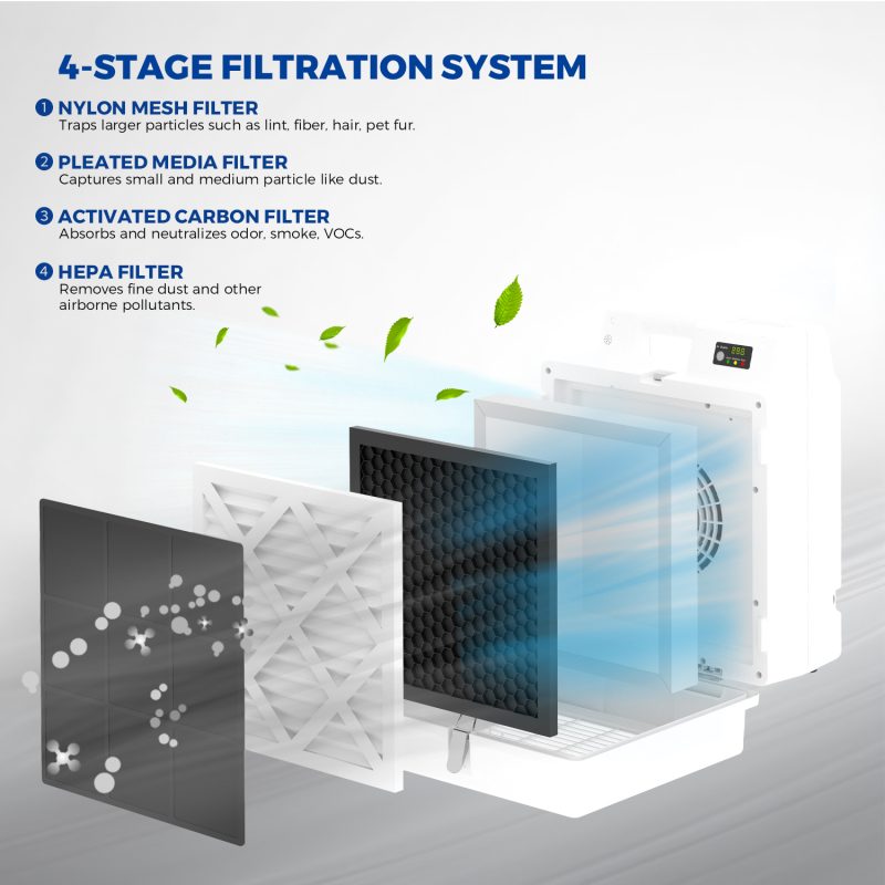 - 4-stage filtration system including activated carbon and HEPA filters