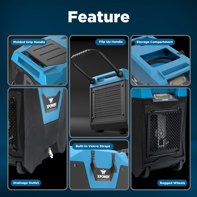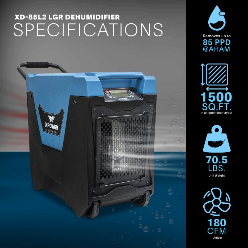 The XPOWER XD-85L2 Low Grain Refrigerant (LGR) Dehumidifier is the updated version of the XD-85LH in that it now has an integrated storage compartment on the top of the housing for the power cord and drain hose, therefore eliminating the need for Velcro straps and saving precious space in your work vehicle. The XD-85L2 LGR Dehumidifier achieves maximum humidity control and water removal efficiency. The ultra-compact design is capable of removing up to 85 Pints Per Day @ AHAM (80°F, 60% RH). The XD-85L2 LGR Dehumidifier features a patented “Dual Intake” which can be closed in temperatures below 68°F to optimize the dehumidification process by reducing the stress level on the compressor. Designed to maximize storage space, the compact XD-85L2 stacks nested up to 3 units high and features 2 molded handle grip points on the top of the unit. BONUS – The XD-85L2 includes a convenient and fully assembled fold-down handle and wheels for easy transport and storage. The XD-85L2 LGR Dehumidifier has an electronic display that assists in monitoring the temperature and humidity at the exhaust, as well as recording the total operating life of the dehumidifier. Lay flat ducting can applied to the exhaust point of the dehumidifier with the ducting ring that is included on the unit to transport warm/dry air to where it is needed. It is easily done by hand without any additional tools. The XD-85L2 LGR Dehumidifier also features an auto purge condensate pump, superior compared to industry competitors, that is capable of purging collected moisture through the provided 40′ drainage hose (10’-12’ vertically and 28’-30’ horizontally). Weighing 70.5 LBS, the easily transportable XD-85L2 gives you the ultimate LGR performance in a size that fits in crawl spaces and other tight areas. Roto-molded Polyethylene Plastic provides a durable housing that is capable of enduring the most rugged restoration jobsites.